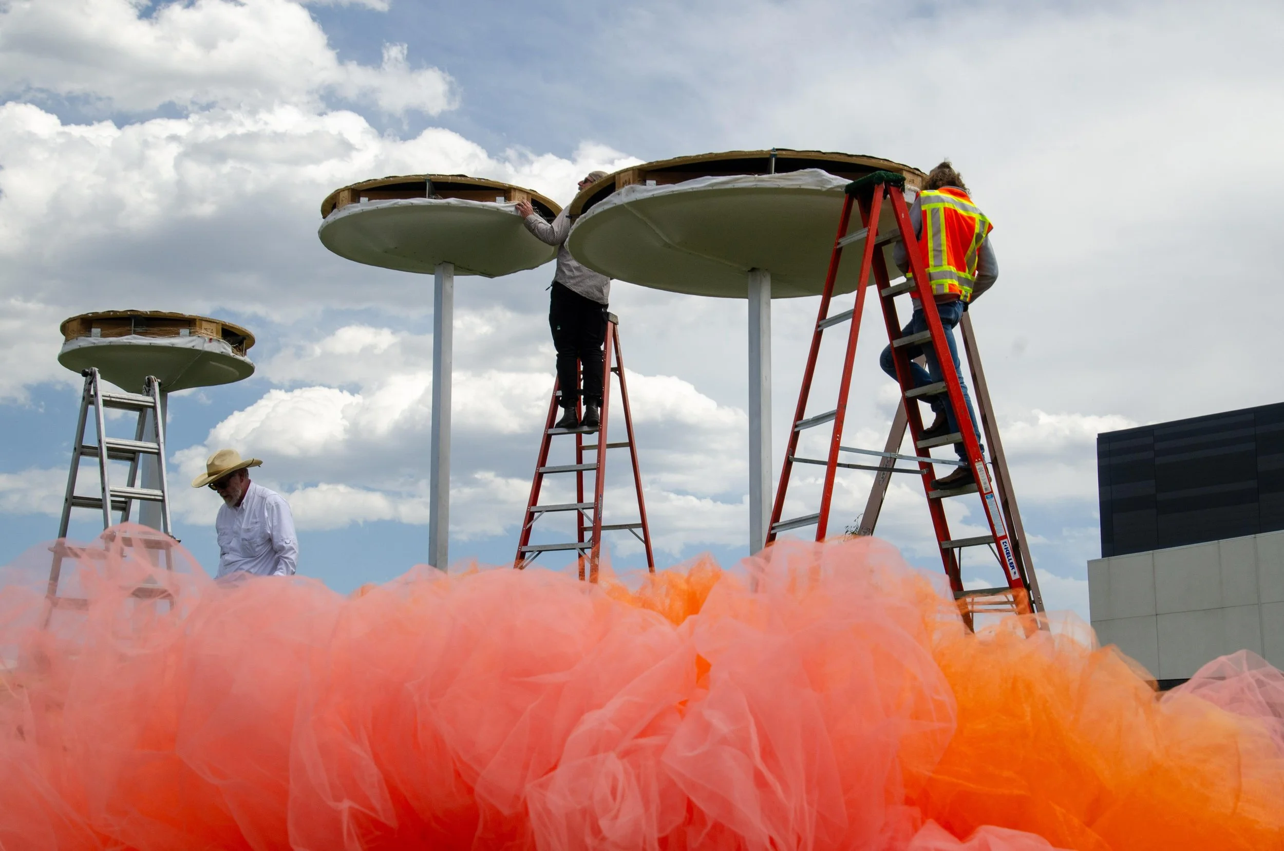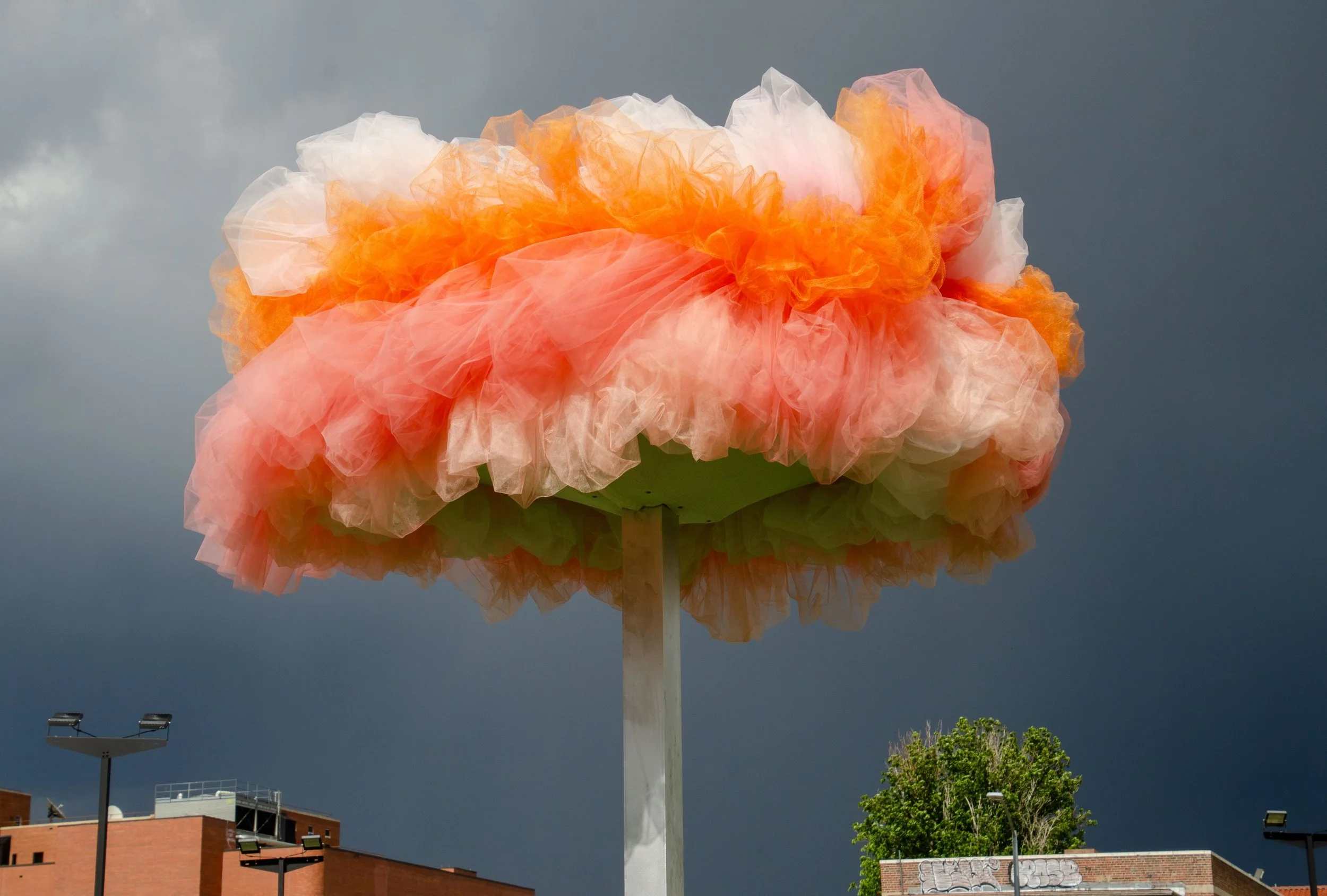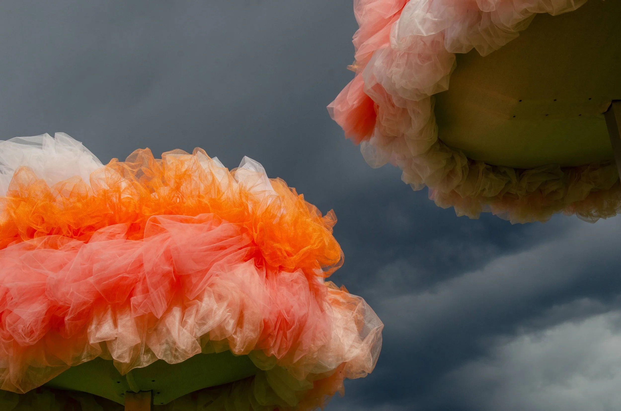 The piece consists of a field of floating circles made of tulle in orange, white, and pink. The flare of colors is intended to “let the sky know” that our longing for birds, flowers, and one another is always within us, and that this longing makes us stronger.