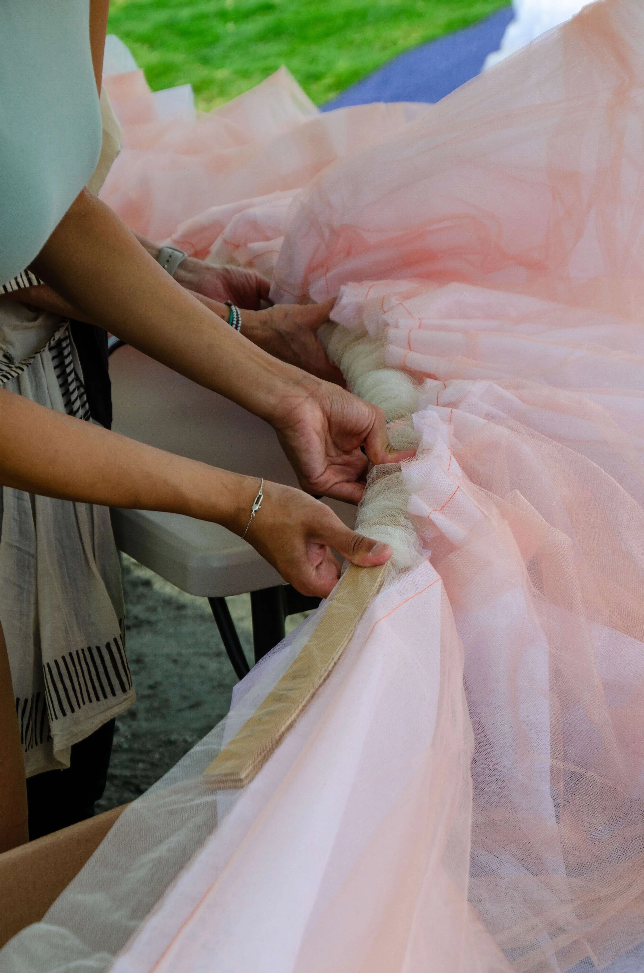 “Installing tulle sculptures outside brings the work in full conversation with the elements, to be fluid amid the inevitable changes, with a sense of surrender and curiosity about how the work might be transformed. It opens a true relationship with the will of the outdoors. For me this is the most vulnerable part of the project, and its beauty and wildness. My sculptural pieces are directly aligned with the notion of abundance, and the unstoppable force that transforms living things and moves them forward. In love with the natural world and often informed by it, my work has always provoked within me a desire to converse beyond the formal, to show wonder at the aliveness of being.”