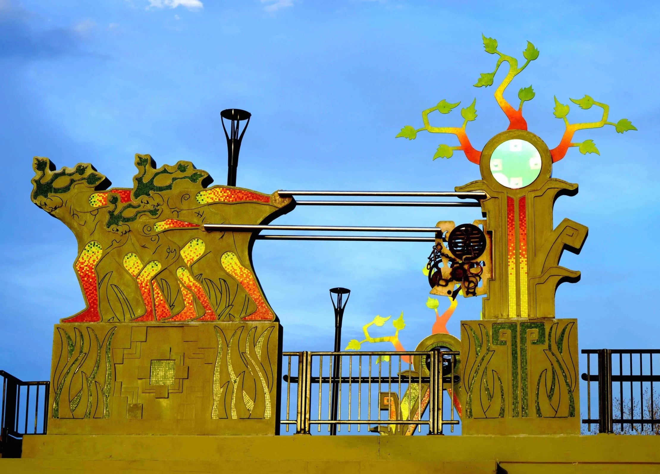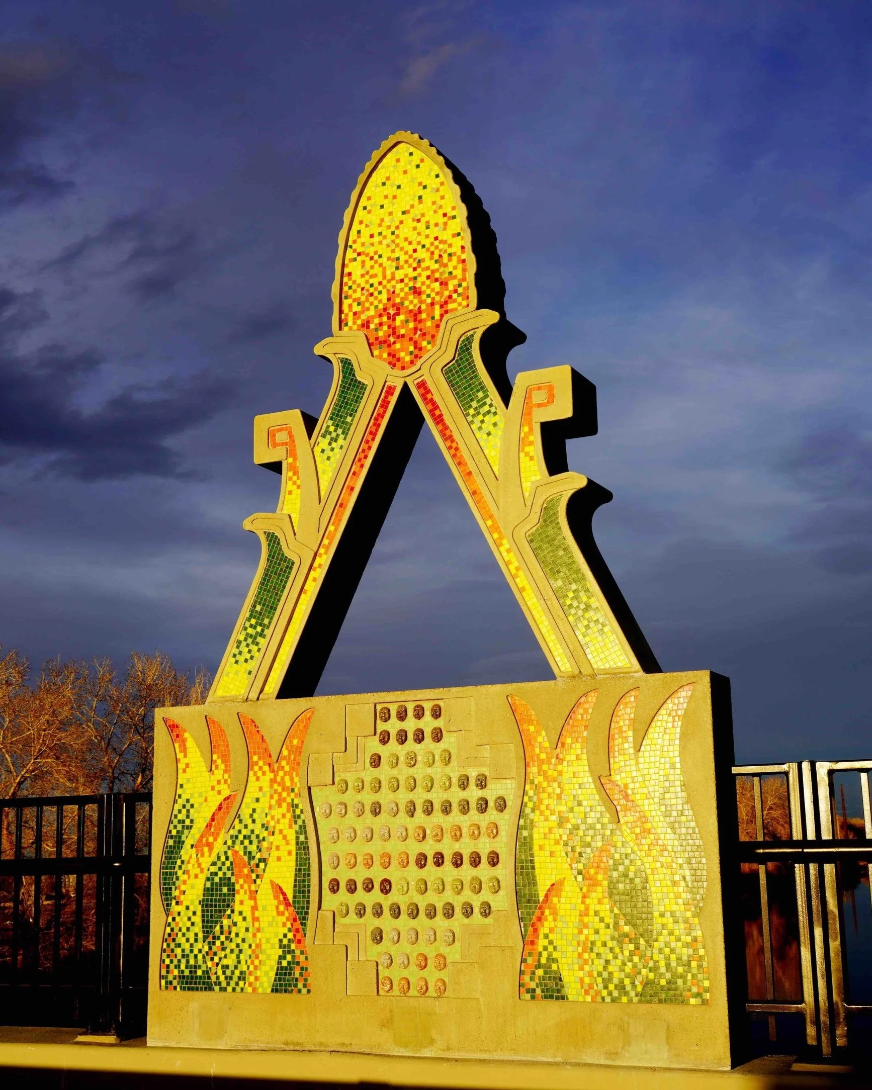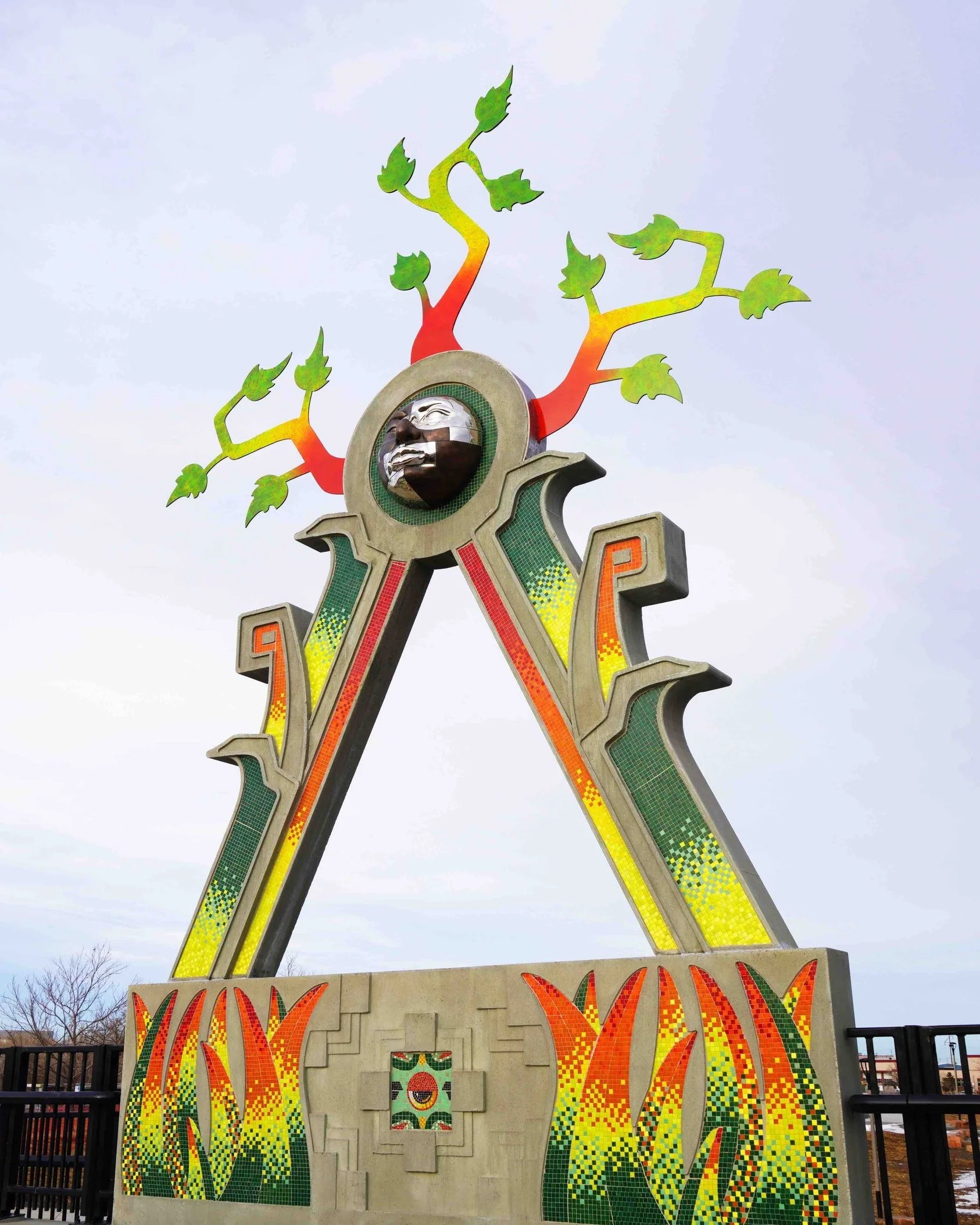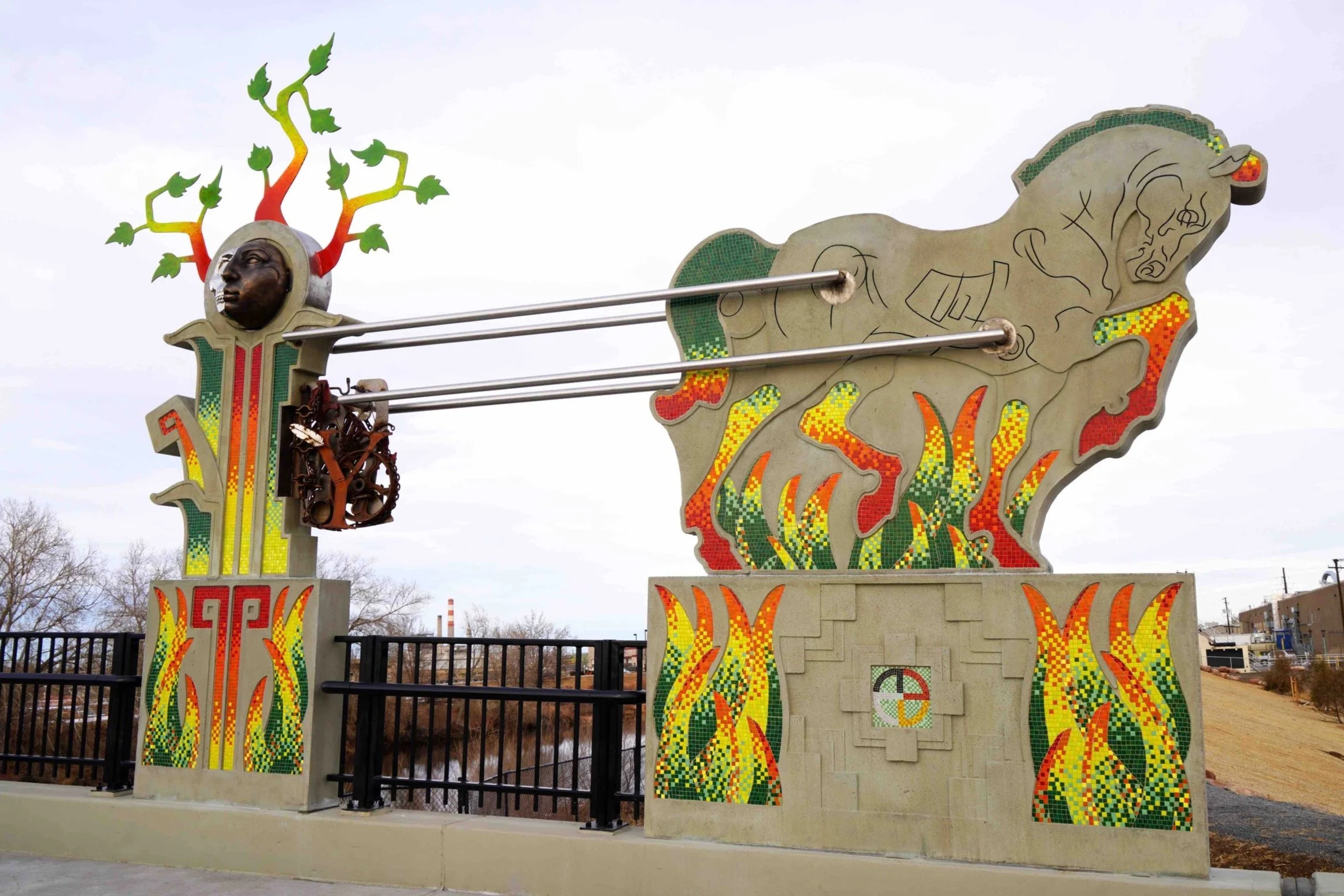 “This art installation is an immersive public space where the viewer can experience history, color, nature, texture and design with the use of materials like ceramic, bronze, cement, and glass. Signature elements were created with the help of hundreds of children and adults from the Globeville and Elyria Swansea community as well as dozens of art fabricators and designers from across the nation. This artwork is a visual manifestation of tribal philosophy, and nature-inspired design, intended to engage the public, while also honoring the history of the community and the First Nations of this land. This revolutionary public art space bridges the past, present, and future in honor of all living things and as an eternal visual representation of human kindness.”
