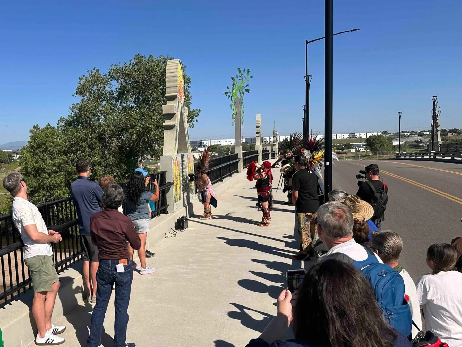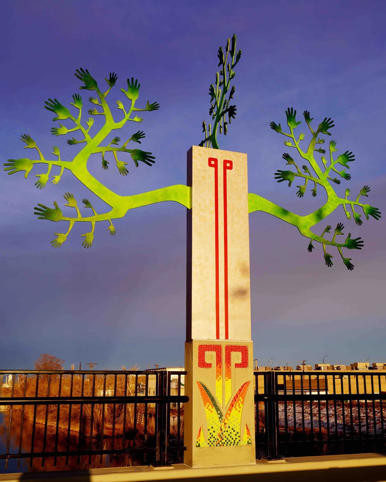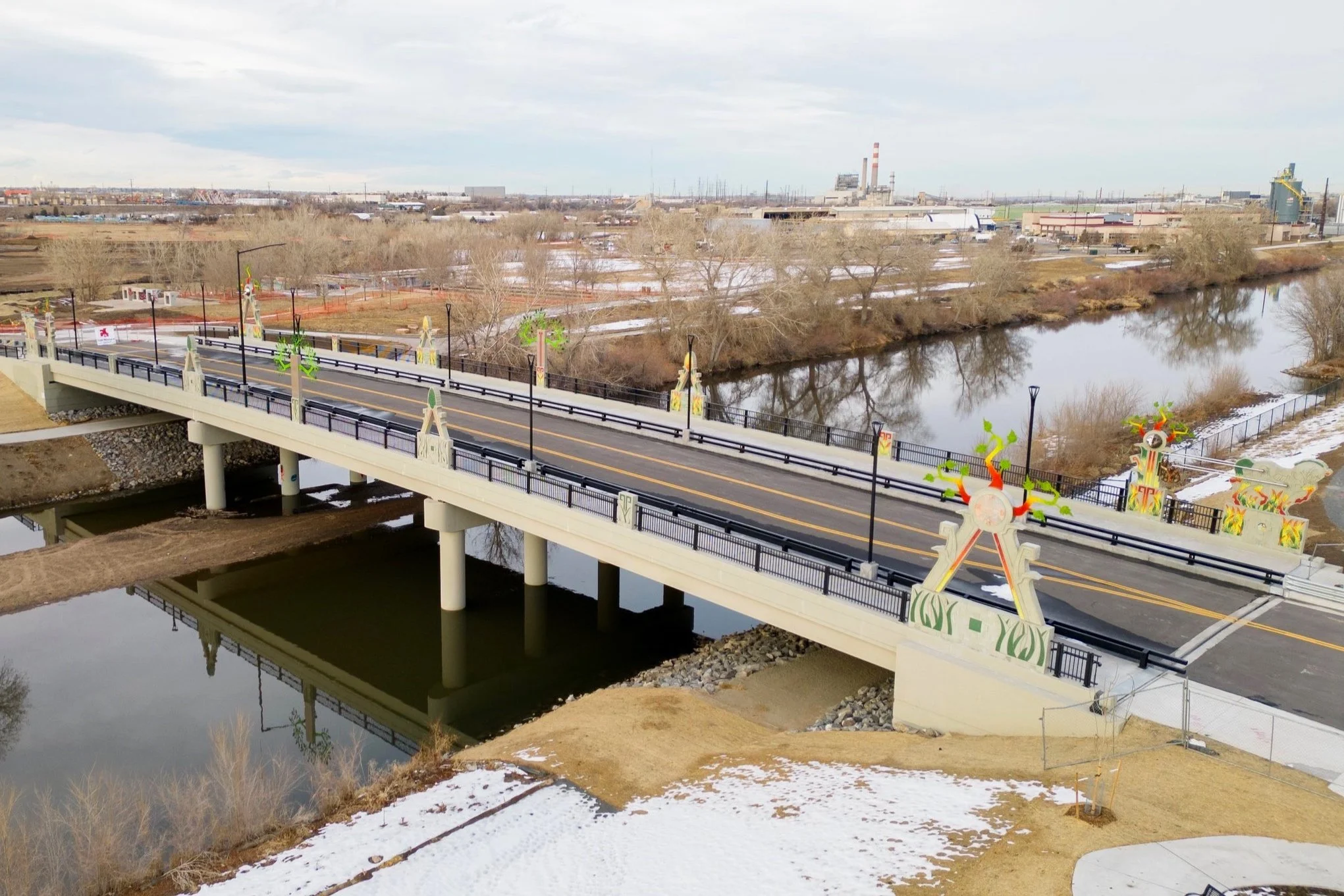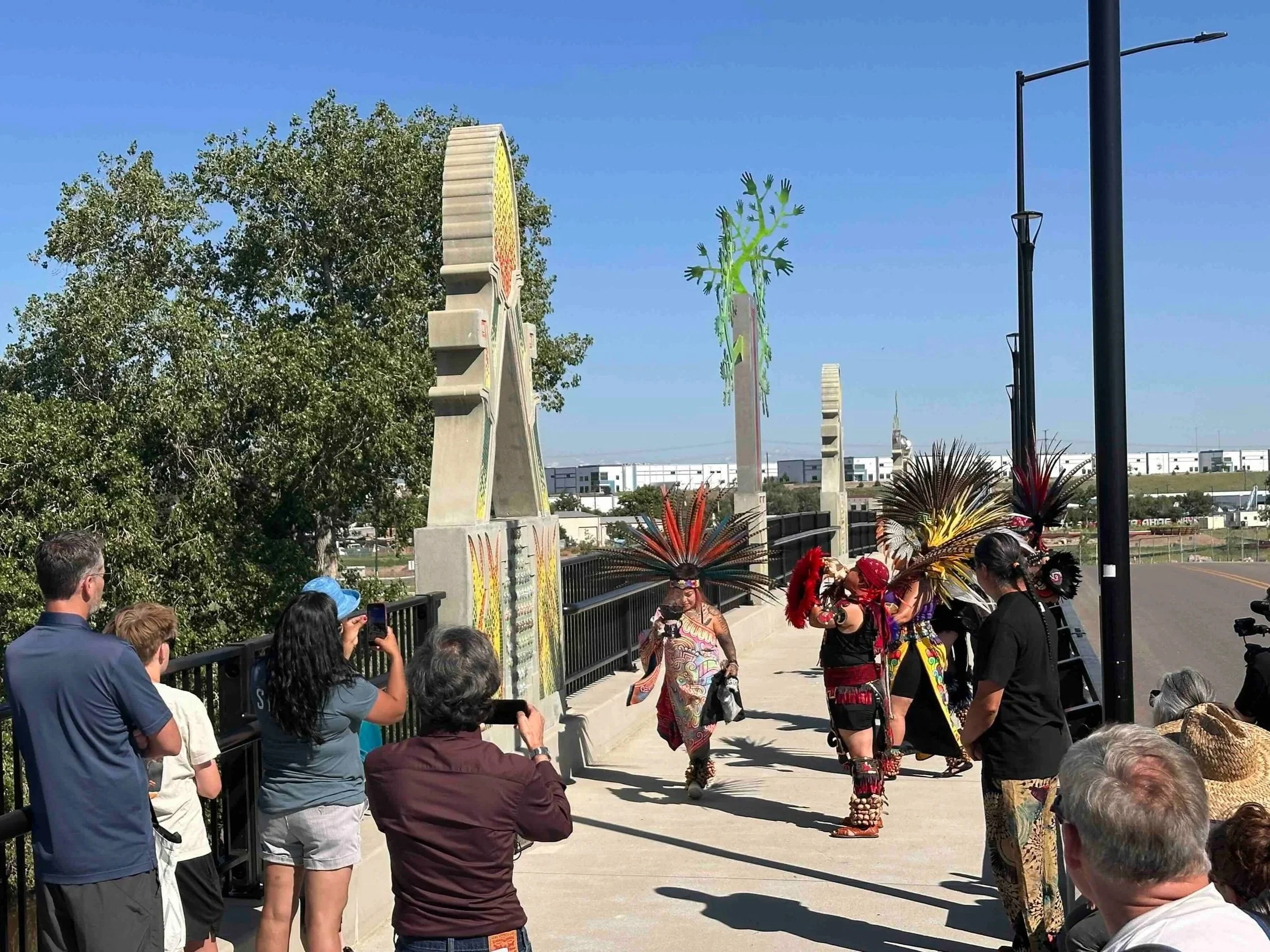 In 2022, People’s Bridge of the Sun was installed along the bridge at 51st Ave that connects the surrounding community to the National Western Center Campus in Denver.