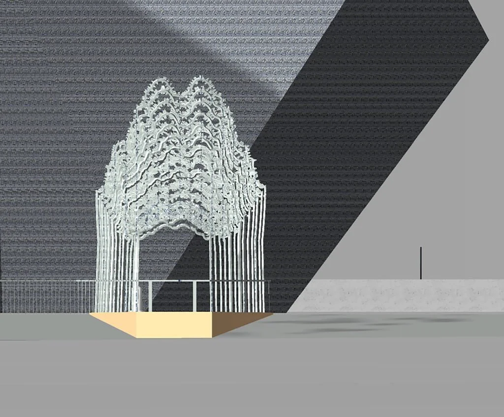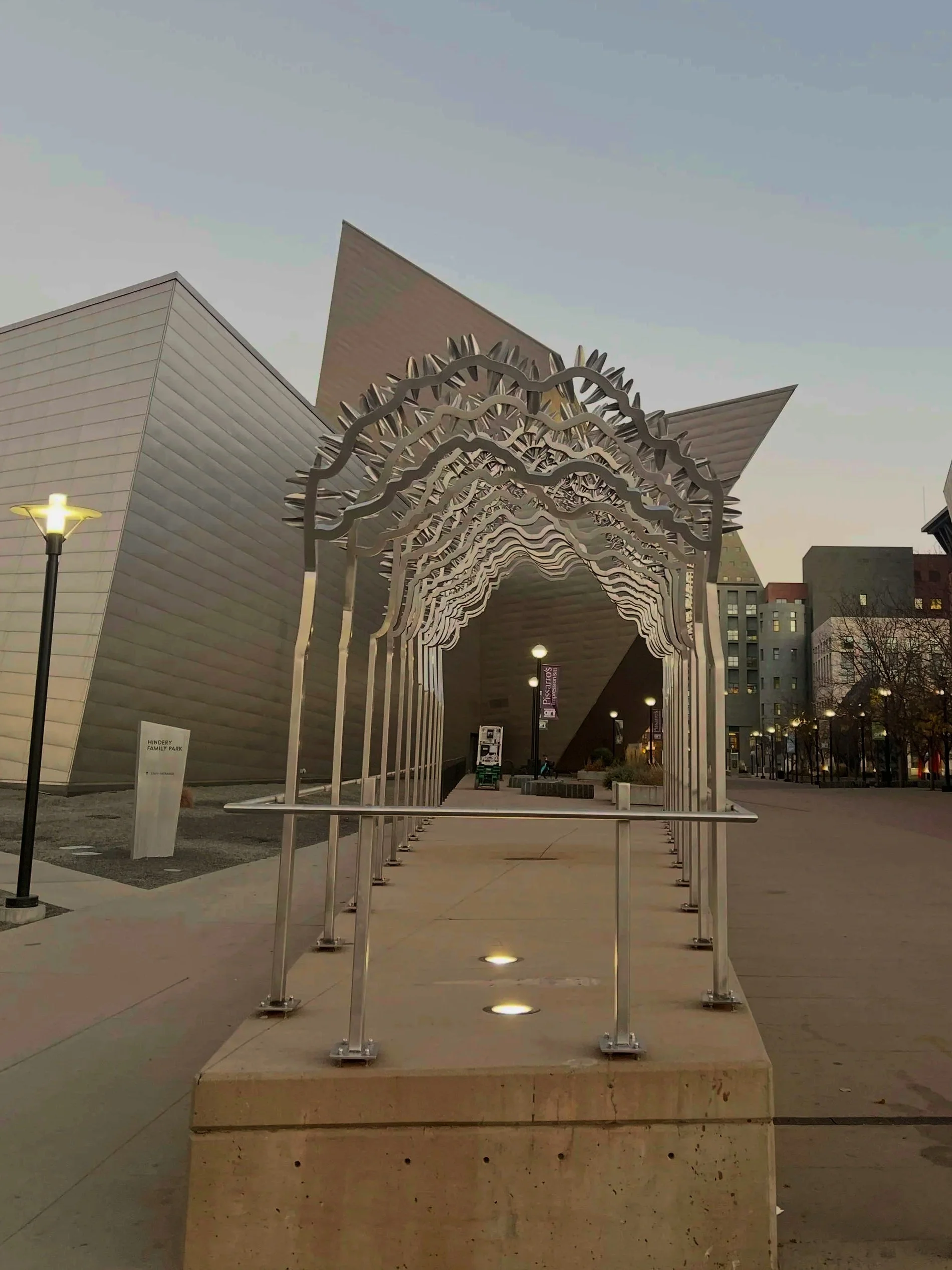 For this site, Castillo designed a truss-like gateway to illustrate how global actions build community and intertwine us. In this sculpture, a railroad bridge is used as a metaphor to remind the viewer that the railroads transformed Denver from a small town to a large and vibrant city. Thousands of hummingbird feathers fabricated out of stainless steel are welded to the hummingbird-inspired trusses to reference the psychic link between the arc of Mexican labor and immigration on the railroads and the story of Denver’s emergence as one of our great American cities. The hummingbird-inspired vision connects the last piece of the story with the first through an Indigenous reference to the hummingbird—revered as a healer and associated with critical community-building traits like harmony, persistence, and integrity.